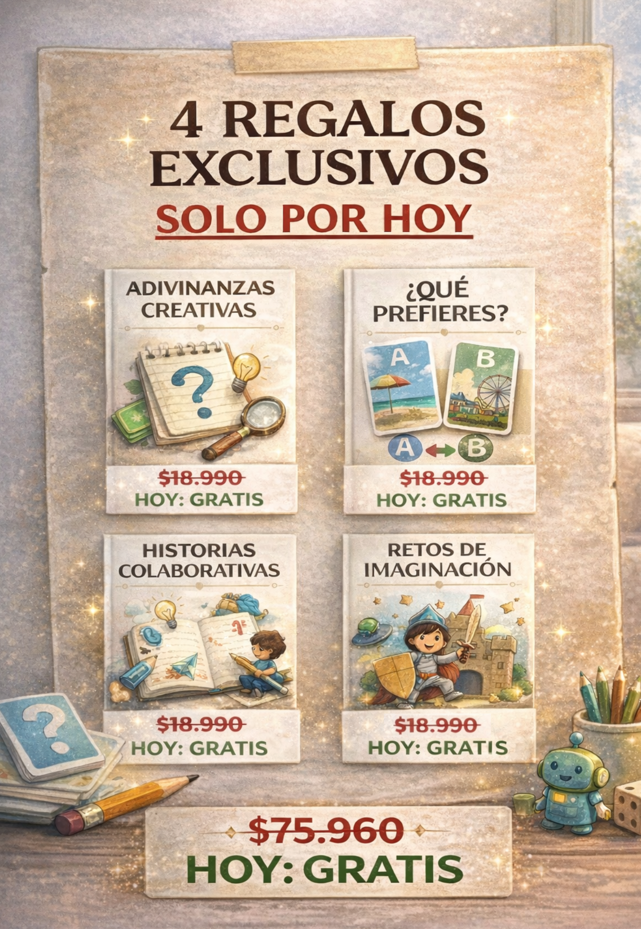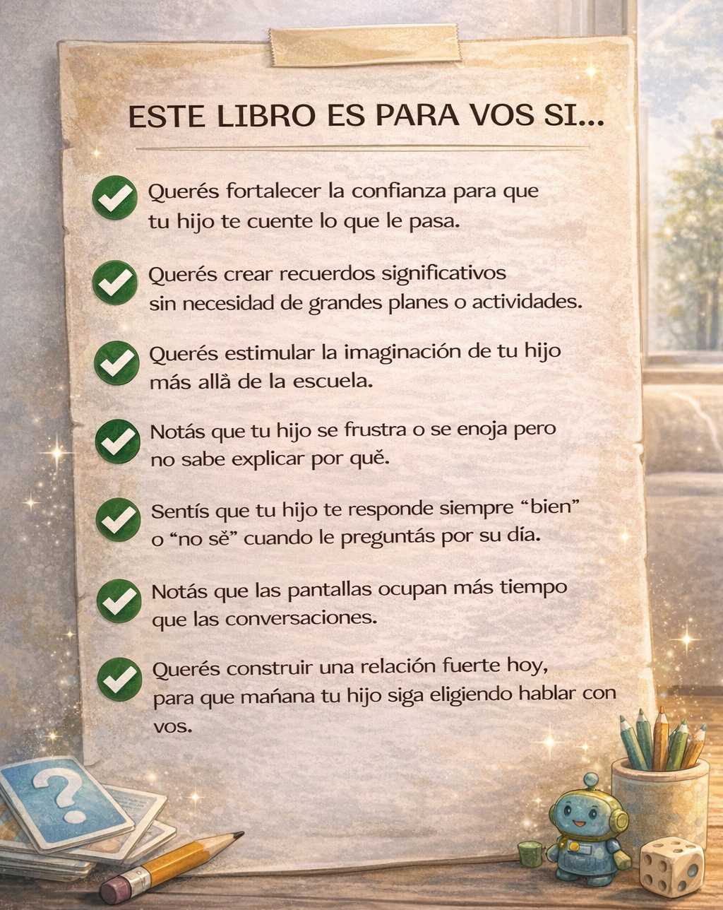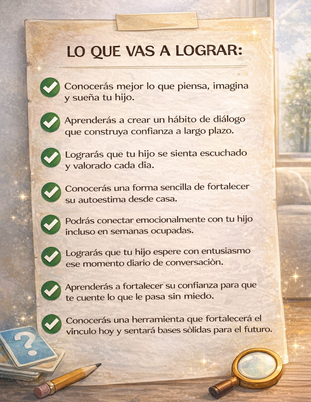 Las preguntas son variadas, dinámicas y pensadas para estimular curiosidad, imaginación y emoción. La idea es que ese momento se convierta en algo esperado, no forzado.